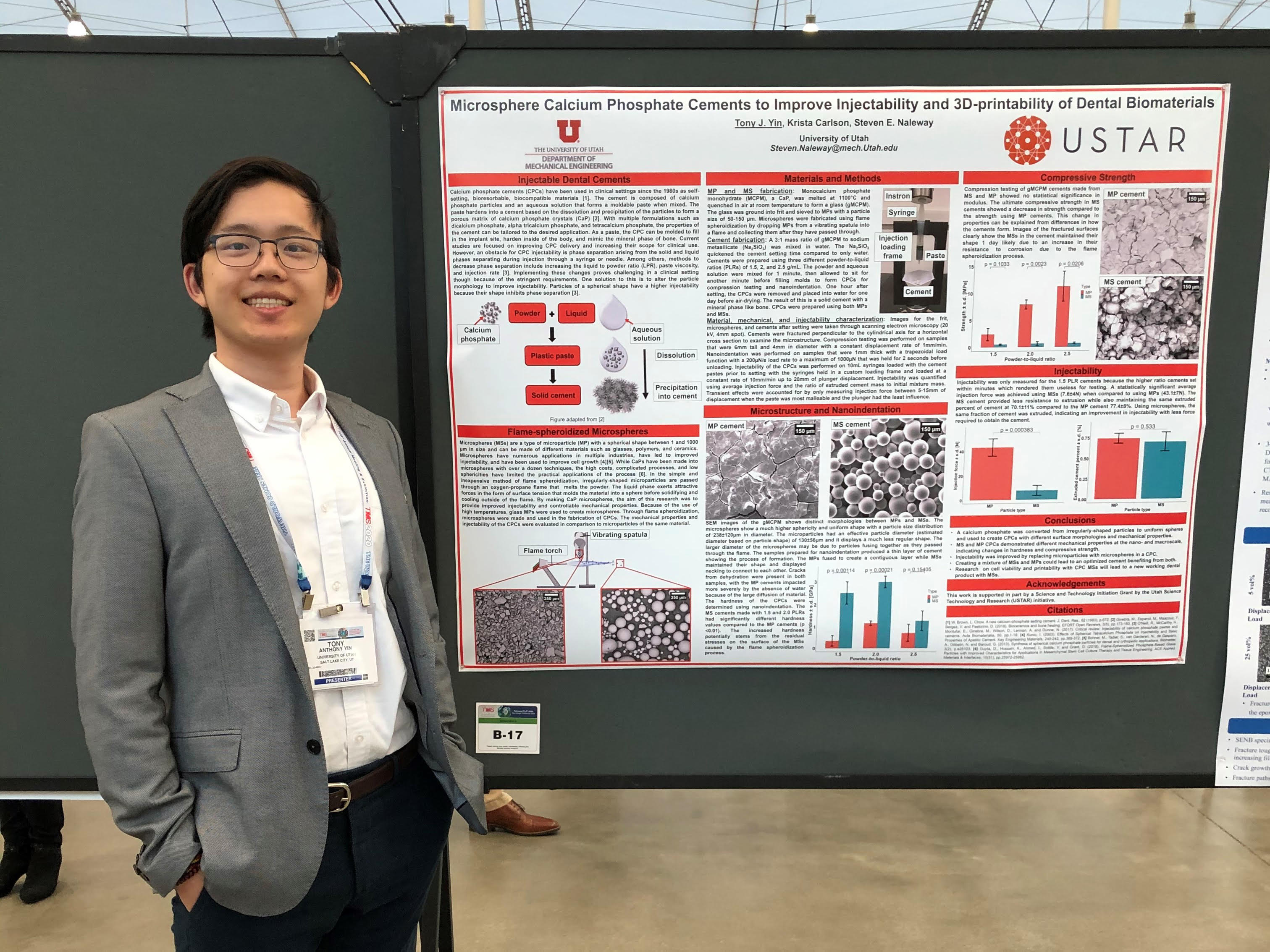 Anthony Yin, ARCS Scholar 2018-2019 is working on his PhD in Mechanical Engineering. His current research is focused on creating porous fluorhydroxyapatite scaffolds using freeze casting. He is analyzing the material and mechanical properties of the porous scaffolds as well as looking into the viability of human osteoblast cells as these scaffolds were made for potential use as biomedical implants for bone repair. Last year Anthony (shown below) presented his research at TMS 2020 (The Minerals, Metals & Materials Society) and was awarded second place in the Biological Materials Science Symposium poster competition for his presentation on "Microphere Calcium Phosphate Cements to Improve Injectabiity and 3D-printability of Dental Biomaterials." Krista Carlson and Steven Nalaway were also authors of the presentation.